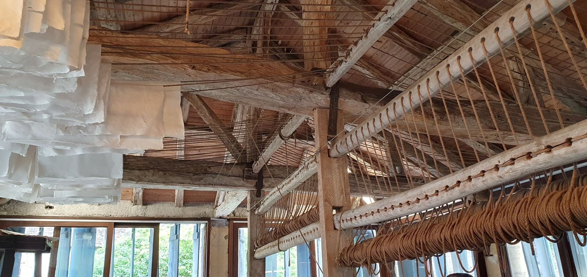 Deze stukjes werden dagen geweekt in water en vervolgens ‘gehamerd’ met een door waterkracht aangedreven machine. De pulp werd ‘geschept’ in houten mallen, geperst en stuk voor stuk te drogen opgehangen van plafond tot vloer. Oh,oh,oh wat een werk.