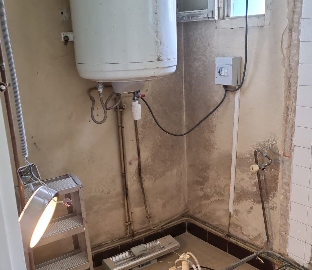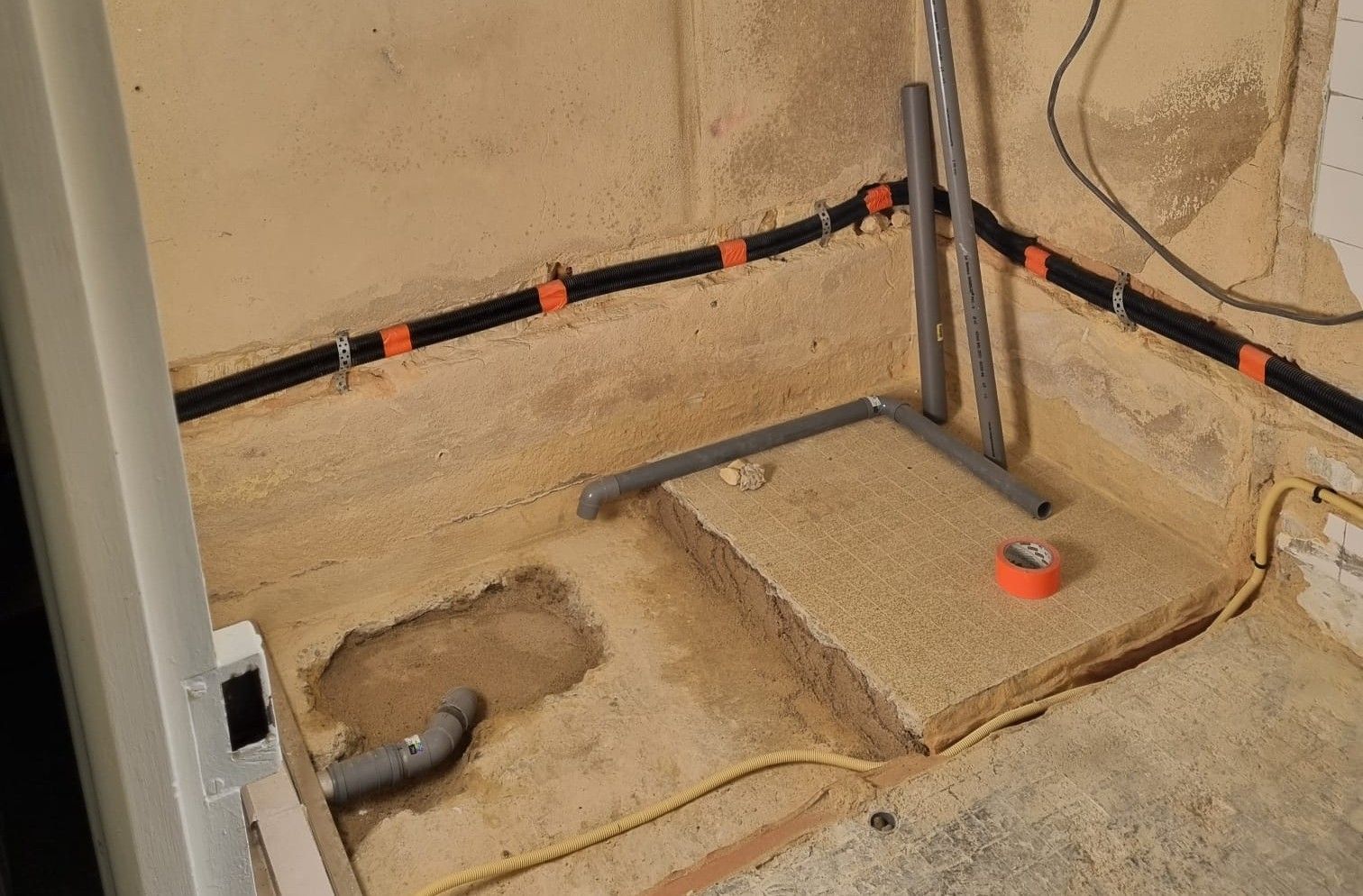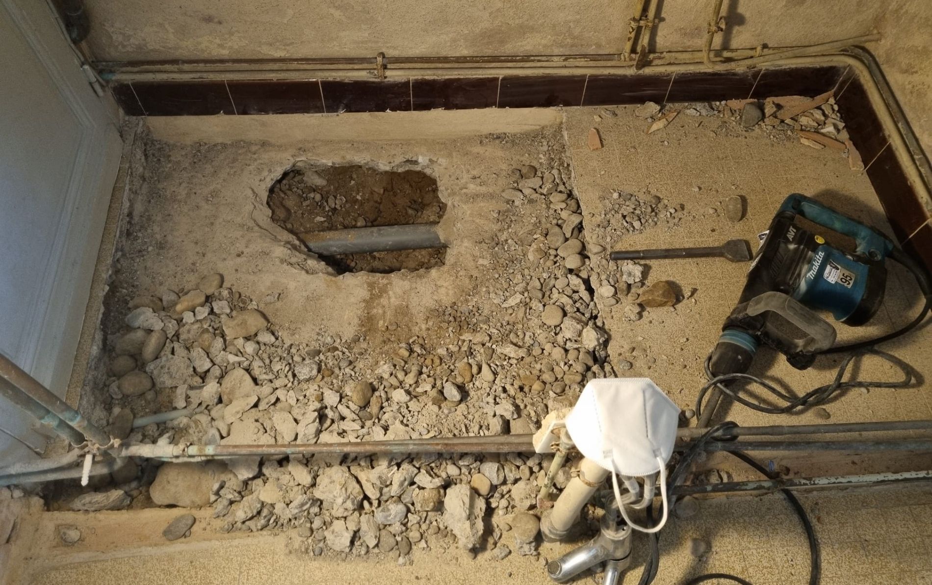 Oude leidingen, niet weten waar de afvoer en electra precies loopt. Ai, een dramatische ontdekking... al dat vocht in de winter blijkt niet alleen vanuit de schoorsteen te komen (die heeft nog een kap nodig) of dakgoten die aan vernieuwing toe zijn.